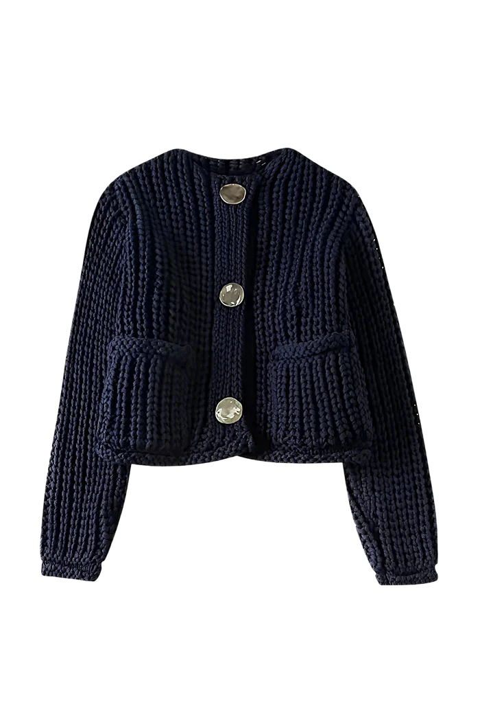 Perfect for layering, this cardigan adds a cozy touch of sophistication to any outfit. The practical pockets and substantial knit make it a must-have piece for both comfort and fashion.